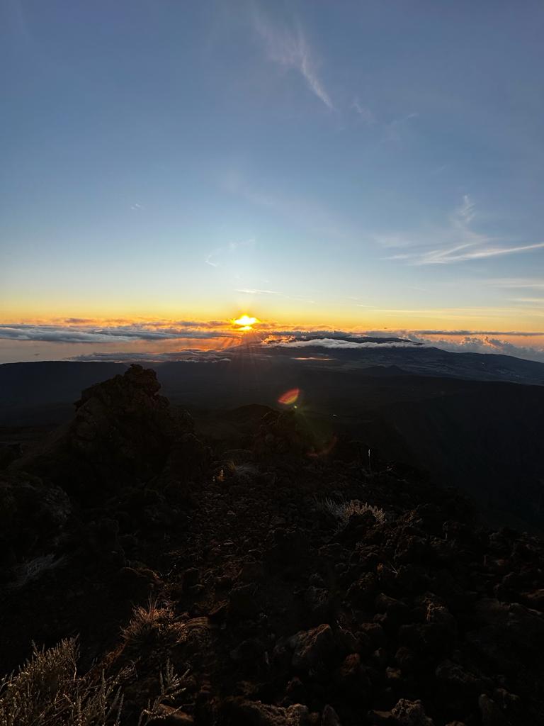 Au sommet majestueux du piton des neiges, à l’aube naissante, lodo était assise devant moi entre mes jambes dans le froid encore glacial. Les premières lueurs du soleil peignaient le ciel d’une palette de couleur vives, créant un décor magique. Les sommets environnants scintillaient sous la lumière matinale.