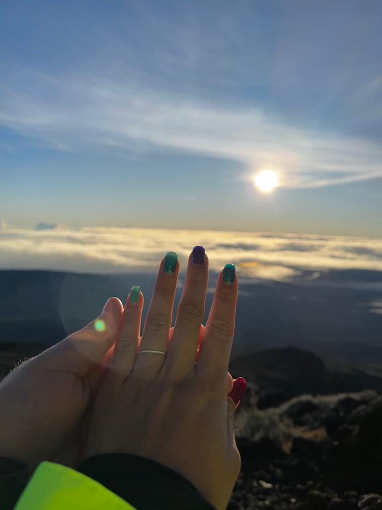 Au sommet majestueux du piton des neiges, à l’aube naissante, lodo était assise devant moi entre mes jambes dans le froid encore glacial. Les premières lueurs du soleil peignaient le ciel d’une palette de couleur vives, créant un décor magique. Les sommets environnants scintillaient sous la lumière matinale.